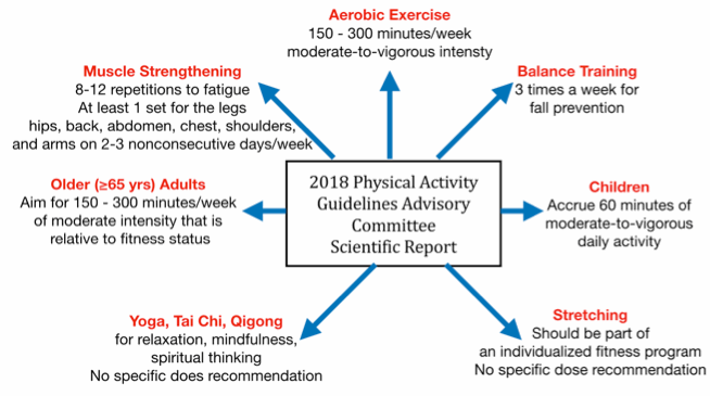 | Inside the Latest Physical Activity Guidelines Len Kravitz, PhD Introduction Fitness pros throughout the world extol the benefits of regular exercise to clients, educating them why starting and staying with an exercise program is the right journey for life. In November, 2018, the U.S. Department of Health and Human Services released the first update of their original 2008 physical activity report with the Physical Activity Guidelines Advisory Committee Scientific Report. Over a period of 20 months, a 17-member expert committee and consultants conducted an extensive scientific review of research, focusing particularly on articles published in the 10 years since the publication of the 2008 report. Overarching messages and details are presented in this column. Current State of Physical Activity: We are Still an Inactive Society The minimal physical activity recommendations for physical activity encourage adults to get at least 150 (and up to 300) minutes of moderate-to-vigorous aerobic activity each week, with muscle strengthening activities on two days during the week to stay healthy. Youth, ages 6 through 17 should do 60 minutes of moderate-to-vigorous physical activity each day. However, according to a press release from the U.S. Department of Health and Human Services, only 19 percent of women, 26 percent of men and 20 percent of adolescents meet these recommendations. According to the new report, the consequences of physical inactivity currently result in approximately $117 billion dollars in annual healthcare costs, with 10 percent of all premature mortality due to a physically inactive lifestyle. The evidence suggests that more time spent in sedentary behavior is associated with the incidence of type 2 diabetes, all-cause mortality, CVD mortality, and the incidence of colon, endometrial, and lung cancer. Highlighted Findings from the New Physical Activity Guidelines Report There are several key findings from the new report that warrant the attention to fitness pros, who may wish to share with clients. Exercise is a boost in brain health: With every single exercise bout a person does, acute improvements in executive function occur. Executive function involves the processes of the brain that help a person manage their daily activities and plan for upcoming future events. Other aspects of executive function include handling behaviors, starting new tasks and controlling emotions. Physical activity has been shown to be a boost for also improving cognition (the process of acquiring knowledge), memory, attention and academic performance. Exercise helps people manage depression: Consistent physical activity reduces depressive symptoms (or the severity of symptoms), and has been shown to be effective in reducing the risk of clinical depression. In addition, women doing moderate-to-vigorous physical activity are less likely to develop postpartum depression than their less active counterparts. As well, pregnant women with anxiety or depression can promote a healthy pregnancy, for both mother and fetus, even if they do low doses of physical activity. Exercise helps improve the quality of sleep: There is impressive evidence that regular moderate-to-vigorous physical activity improves a person's quality of sleep. The research indicates that exercise lessens the length of time it takes to go to sleep as well as cuts the time a person is awake after going to sleep. Consistent exercise has also been shown to increase deep sleep while lowering daytime sleepiness. Most interestingly, the research also highlights that, in general, the time frame before bed time at which the physical activity is completed does not matter. The health benefits of exercise are equivalent for bouts of physical activity performed more than 8 hours before bedtime, 3 to 8 hours before, and less than 3 hours before bedtime. Every bout of exercise, no matter how long, improves quality of life: A most encouraging finding in the new report is there are immediate health benefit from a single bout of activity, such as reduced anxiety improved blood pressure, better quality of sleep, and improved insulin sensitivity. In the 2008 guidelines it stated that a minimum of 10-minute bouts of physical activity was necessary to improve markers of health. This previous requirement has been removed, because activity, of any length of time, generates a positive impact on a person's quality of life. Exercise is important for weight management: A stinging point for many fitness pros has been how various media and professional outlets have minimized the important role of exercise in weight management program. The report summarizes that there is a strong correlation between greater amounts of physical activity and decreased weight gain in adults. The evidence indicates a positive influence on exercise in weight gain prevention occurs when doses are greater than or equal to150 minutes per week at a moderate-to-vigorous level of intensity. Walking step counts still make a difference. The new document states that step counts are quite easy to understood by most people and support the public health message to move more in a person's daily life. Walking steps can be at light-, moderate-, and vigorous-intensity levels, providing a broad range of exertion choice to promote walking for levels of fitness and at all ages. However, because of this range of intensities, and the potential for varied outcomes, the new physical activity guides does not support a specific number, such as 10,000 steps per day. Higher intensity exercise is better for cardiovascular health. The new Physical Activity Guidelines clarifies that exercising at higher intensity brings greater gains in cardiorespiratory fitness than steady state exercise, but also has a greater risk of injury, especially if one is unaccustomed to vigorous physical activity. The report adds the caveat that the long-term sustainability of HIIT training regimens is currently not fully known. Alas, even with t