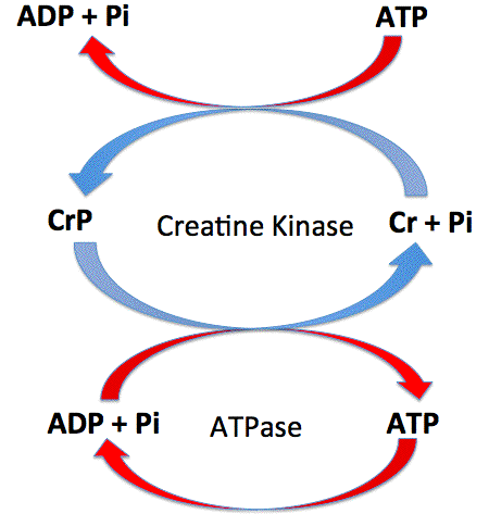 | During short-term, intense activities, a large amount of power needs to be produced by the muscles, creating a high demand for ATP. The phosphagen system (also called the CrP-ATP system) is the quickest way to resynthesize ATP. Creatine phosphate (CrP), which is stored in skeletal muscles, donates a phosphate to ADP to produce ATP. During rest the ATP will help to restore CrP. |