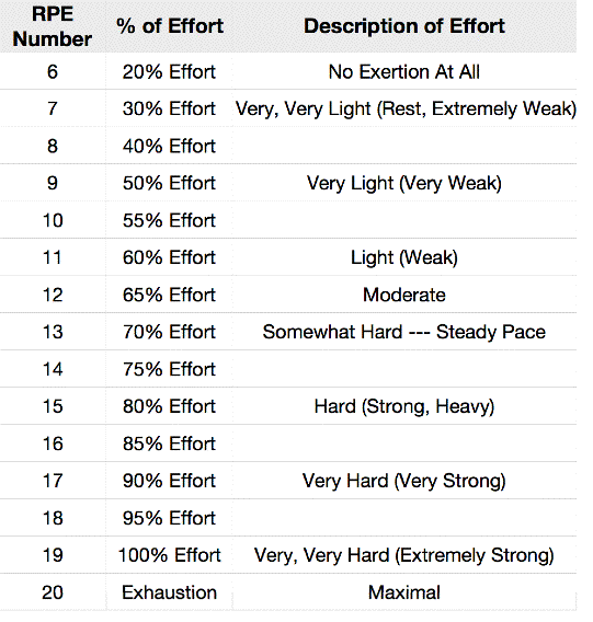 RER represents respiratory exchange ratio. This is the ratio of CO2 expired to O2 consumed Predicted (or estimated) maximum heart rate is 220-Age. So, a predicted maximum heart rate for a 20-year-old student is 220-20=200 beats per min. Remeber, we look at heart rate in beats per min. Plateau of VO2 means the following: A maximal aerobic test progressively gets harder for the sujbect. When the oxygen consumption (VO2) plateaus < 150 ml/min VO2 as the test continues to get harder it is a very good indicator that the subject is at or near their actual VO2max capacity. Note the Rating of Perceived Exertion chart below. It shows an example of the %intensity with each number. The two anchors are 6 (which is very quiet seated rest) versus 20 (which is the point of exhaustion from working as hard as you can). Although VO2peak varies from textbook to textbook, for PEP326L a VO2 peak test is when a subject gives a maximal effort in an aerobic capacity test but does NOT attain any of the criteria. It means the subject worked as hard as she/he could, but did not attain the VO2max criteria. |