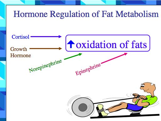| 													|  |  							| During exercise the secretion of glucagon, norepinephrine, and epinephrine increase glycogenolysi, thus providing more glucose for anaerobic exercise. Note: Cortisol is more involved in gluconeogenesis during sustained bouts of aerobic exercise when carbohydrate resources are depleting. |  							|  |  							|  |  							| With sustained exercise the release of cortisol, growth hormone, norepinephrine and epinephrine increase lipase enzyme activity, which increases the oxidation of fatty acids. |  							|  |  							|  |  							|  |  |  |