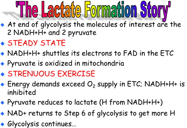 At the end of glycolysis 2 NADH+H+ and 2 pyruvate are two of the molecules of interest. During steady state conditions the NADH+H+ molecules go into the inner membrane of the mitchondrion and reduce FAD to FADH2 (NADH+H+ cannot get past the inner membrane). Pyruvate goes directly into the mitochondrion matrix to be oxidized. However, during strenuous exercise the energy demands exceed the oxygen supply in the ETC, causing a back-up in the ETC. NADH+H+ is inhibited and therefore donates its hydrogens to pyruvate, reducing pyruvate temporarily to lactate. NAD+ can then return to Step 6 of glycolysis to pick-up more hydrogens, and glycolysis can continue. Note that 50-75% of the lactate will be converted back to pyruvate and used for fuel in the Cori cycle. Andrea Schoeny, 2011