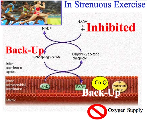 Inhibited Shuttle of NADH +H+ to FAD in the Mitochondrion in Strenuous Exercise Conditions