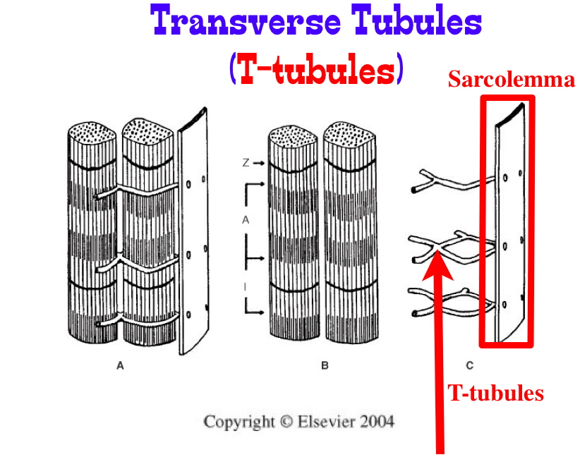 Note how the t-tubules are actually extending structures from the polarized sarcolemma membrane. The t-tubules are also polarized (thus there is a difference in charge on the inside and outside of its membrane).