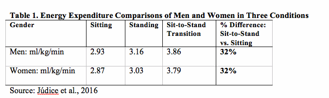 Break Up a Sedentary Day with Active Standing Len Kravitz, Ph.D. Introduction It is an inspiring time to be a fitness professional. Now, more than at any other period of time, we have the scientific evidence that shows the tremendous favorable impact that physical activity and exercise convenes on managing and reducing chronic diseases, improving brain health, lowering blood pressure, reducing depression and anxiety, controlling obesity and many other health benefits. In this column, we focus on three scientific publications that help define a road map of where we are headed in helping people combat sedentary lifestyles. Sedentary Behavior Terms Clarified As the young science of sedentary behavior study develops and evolves, researchers have realized a need for consistency in terminology and standardization of techniques used in this research. Enter the Sedentary Behaviour Research Network (SBRN). The SBRN (2017) is a network connecting researchers and health professionals from around the world who all share a common interested in sedentary behavior research. The SBRN currently is composed of 1273 members from 35 countries (Tremblay et al., 2017). The following are three key terminology definitions related to sedentary behavior research (Tremblay et al., 2017). 1) Sedentary behavior is any waking behavior characterized by an energy expenditure &Mac178;1.5 METs while in a sitting, reclining or lying posture. A MET, expressed as 3.5 ml oxygen/kg/min, is a method of describing the energy expenditure of activities in a way comparable among persons of different weight. 2) Physical inactivity is an insufficient physical activity level to meet present physical activity recommendations. For adults, this means NOT achieving 150 minutes of moderate-to-vigorous-intensity physical activity per week or 75 minutes of vigorous-intensity physical activity per week or an equivalent combination of vigorous and moderate-intensity activity. 3) Standing is a position in which one has or is maintaining an upright position while supported by one's feet. Furthermore, passive standing refers to any waking activity in a standing posture expending &Mac178;2.0 METs, such as standing in a conversation, standing in a line, or standing at a religious service. Contrariwise, active standing refers to a standing posture with an energy expenditure >2.0 METs such as while lifting weights, standing on a ladder and/or standing while working at a work station, such as an assembly line. How Much Energy is Required Going from a Sit to a Stand? As fitness pros, we regularly encourage clients to sit less, stand more and move a lot during their waking day. Uniquely, an emerging area of research is to quantify the metabolic benefits of interrupting sitting time with frequent bouts of standing. An original investigation by Júdice et al. (2016) recruited 50 men and women volunteers, 20-64 years, with no known diseases, to perform three randomized 10-minute conditions (in one session). It should be highlighted that prior to participating in the experimental session, participants were instructed not to consume any calorie-containing beverages or food for 8 hours. In addition, they were told not to engage in any exercise, ingest caffeine or take any type of stimulant for 48 hours prior to their study test. The three 10-minute conditions were as follows: 1) spending 10 continuous minutes standing motionless with arms resting down along the side; 2) spending 10 continuous minutes seated in a chair motionless with hands on thighs; 3) performing a sit/stand transition each minute during 10 continuous minutes. Participants stood up from the seated position and returned to the seated position in one single action movement at the 30-second mark of each minute. Therefore, they performed a total of 10 sit/stand transitions. The researchers presented the results by sex, with the oxygen consumption (ml/kg/min) data depicted in table 1. Perhaps the most noteworthy finding from this study is that 10 sit-to-stand transitions (during a 10-minute period) expends 32% more energy than just sitting for 10 minutes for both men and women. Júdice et al. extrapolated that this additional energy expenditure (during the 10 minutes) is about 3.2 kilocalories. The researchers further recap previous research that shows, on average, a typical office worker does 52 sit-to-stand transitions a day, which is about 16.6 kilocalories. These data confirm that increasing the number of sit-to-stand transitions daily, will over the long run contribute positively to caloric expenditure. Interestingly, the energy expenditure comparison of standing versus sitting (table 1) shows only slightly higher values with standing for both men (8% higher) and women (6% higher). Final Take-home Message: Although standing work stations are gaining wonderful popularity, their benefits appear to be better realized in body posture, alignment and work productivity. For enhancing energy expenditure, the public health message should be to interrupt sustained periods of sitting with sit-to-stand transitions, and of course progressively add more movement once standing. Does Changing Sitting Patterns Help Thwart Type 2 Diabetes in Older Populations? Type 2 diabetes management involves concentrated lifestyle modifications, which include weight loss, moderate intensity cardiovascular exercise and resistance training. Currently, very little is known about type 2 diabetes prevention in adults over the age of 75. With this population, moderate levels of physical activity may be too challenging to complete. A recently published investigation by Bellettier et al. (2019) provides some thought-provoking sedentary behavior findings for this special population. In this study, the researches tracked 6, 116 ethnically diverse community-dwelling women aged 63-99, with accelerometers (devices designed to objectively quantify physical activity) 24 h/day for up to 7 days. A major finding of this study was that wom