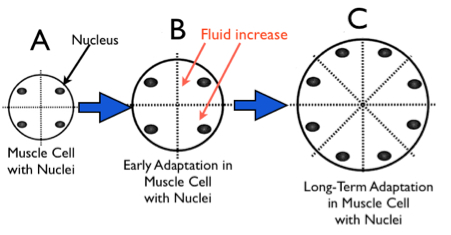 | Skeletal Muscle Hypertrophy Len Kravitz, Ph.D. Introduction Determining the optimal resistance training program for the development of skeletal muscle hypertrophy (size) is of great interest to many personal trainers working with clients who seek increases in muscularity. Morton et al. (2016) summarize current recommendations suggesting loads of 70% to 85% of a person's one-repetition maximum (1RM) are traditionally considered a criterion for maximizing skeletal muscle hypertrophy from resistance training. The authors continue that these loads have been conventionally considered best for recruiting more motor units (the nerve and muscle fibers innervated by the nerve). Two original research studies indicate some meaningful new insights into hypertrophy training and are reviewed in this column. Study 1. Morton, R.W. et al. (2016). Neither load nor systemic hormones determine resistance training-mediated hypertrophy or strength gains in resistance-trained young men. Journal of Applied Physiology, 121, 129-128. Purpose: The purpose of this research was to 1) was to determine the effects of a 12-wk higher-repetition (using lighter weights) vs. a lower-repetition (using heavier weights) weight training intervention on skeletal muscle hypertrophy and strength in resistance-trained men; and 2) to investigate whether the immediate post-workout increase in body hormones was associated with skeletal muscle mass or strength changes. Participants: Forty-nine resistance-trained (2 yrs of total body weight training) males (ave age =23 yr) volunteered to participate in this study. Prior to the study, all participants were familiarized with the resistance training exercises and completed a 10-repetition maximum (10RM) and1RM on the incline leg press, bench press, knee extension, and shoulder press. Training Program. The participants were randomly assigned to either a high repetition (HR) (n=24) or low repetition (LR) (n=25) group. The HR group performed 3 sets of 20-25 repetitions per set, with each set being performed to volitional fatigue (i.e., failure). This load was about 30% to 50% of their 1RM. The LR group performed 3 sets of 8-12 repetitions per set (to volitional failure), which corresponded to 75-90% of 1RM. Each participant completed four days/week (Monday, Tuesday, Thursday, Friday) of resistance training. The Monday/Thursday workouts included incline leg press followed immediately by a seated row, referred to as a superset, with a one-minute rest between each superset. Superset two was barbell bench press with cable hamstring curl, and the workout was completed with 3 sets of planks. On Tuesday/Friday, superset one consisted of machine-guided shoulder press with biceps curls, and superset two was triceps extension with wide-grip latissimus dorsi pull downs. The session was completed with 3 sets of machine-guided knee extensions. All training sessions were supervised by a personal trainer, who confirmed each set was performed to failure, and also made sure the correct repetition range was maintained during the 12-week study. Participants consumed 30 g of whey protein twice per day: immediately following RT on training days and 1-2 hours prior to sleep. On non-training days, participants consumed the first dose in the morning and the second dose 1-2 hours prior to sleep. Results: Unpredictably, the HR and LR were equally effective in stimulating skeletal muscle hypertrophy (as measured with muscle biopsy techniques) in this resistance-trained group of males. As well, when participants were tested periodically for maximal strength, the increases in muscular strength were equally similar, with the exception of the bench press, which increased to a greater extent in the LR group. In addition, post-exercise levels of circulating hormones did not change as a result of the RT intervention and the researchers summarized they were unrelated to changes in muscle mass and strength. Take-Away Message: The researchers concluded that training to volitional failure is the most important variable for skeletal muscle hypertrophy gains in males. They summarized that trained males exercising to volitional failure between 30-90% 1RM will sufficiently activate skeletal muscle motor units, which is the driving mechanism for skeletal muscle hypertrophy. The researchers propose that if a client's primary goal is to increase 1RM strength, then performing exercise with heavier loads should be periodically (or consistently) required for optimal improvement. Personal trainers always design resistance training programs reflective of a client's goals and preferences. The combined use of heavier and lighter loads or 'rep zones', as in periodized programs, will offer variety in the resistance training stimulus and result in equally effective gains in muscle size and strength, as long as all training sets are completed to failure. Study 2. Herman-Montemayor, J.R., Hikida, R.S. & Staron, R.S. (2015). Early-phase satellite cell and myonuclear domain adaptations to slow-speed vs traditional resistance training programs. Journal of Strength and Conditioning Research, 29(11), 3105-3114. Purpose: Satellite cells (SCs) are cells found between the sarcolemma and basal lamina of muscle. Herman-Montemayor and colleagues summarize that several studies have shown that a resistance training stimulus in young and old males and females directly influences an increase in SC content. The authors continue that an increase in SCs influences the volume of muscle fluid (cytoplasm or sarcoplasm), referred to myonuclear domain (MND) and that SCs are also consequential in long-term changes in skeletal muscle hypertrophy (including the number of muscle fiber nuclei-muscle cells are multi-nucleated). This is the first study to ever investigate the effect of slow-vs normal-speed strength training on varying intensities on SC content, myonuclear (nucleus of muscle cell) number, fiber type and MND. Participants: Thirty-four untrained (no exercise wi