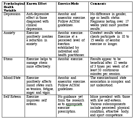 Exercise and Psychological Health Len Kravitz, Ph.D. Study Reviewed: Scully, D., Kremer, J., Meade, M.M., Graham, R., Dudgeon, K. 1998. Physical exercise and psychological well being: a critical review. British Journal of Sports Medicine, 32, 111-120. Introduction The literature continues to expand supporting major health benefits of regular physical activity and exercise including a reduced risk of cardiovascular disease, hypertension, and stroke as well as protection against some cancers and osteoporosis. However, there is also a growing body of knowledge that substantiates that physical activity also improves psychological well-being. This article will highlight a more recent review article on the effects of physical activity and mental health variables such as depression, anxiety, stress, mood state, and self-esteem (Summary in Table 1). It is important to note that much of this research is referred to as correlational, which means the scientists are studying associations that exist between exercise and mental health variables, and not actual causal relationships. Because of this, although some exercise prescriptions for certain psychological health variables are presented, at this stage they must be interpreted and used with prudence. Exercise and Depression It should be noted that individuals with clinical depression tend to be less active than healthy average adults. Therefore, from a general health perspective, physical activity should be encouraged for this population. It is interesting to note that aerobic and anaerobic exercise seem to be equally effective in producing antidepressive effects. Perhaps most interesting has been the response of patients (with diagnosed depression) describing exercise as "the most important element in comprehensive treatment programmes for depression." It appears that acute exercise bouts (single sessions) as well as chronic exercise training programs (over a period of time) have a positive effect on those with clinical depression. The research does infer that the greatest antidepressive effects seem to occur after 17 weeks of exercise, although observable effects begin from 4 weeks onward. In addition, the effects of exercise on depression seem equivalent with both genders and uninhibited by age or health status. Although no research guidelines exist for an actual exercise prescription, some researchers suggest following the ACSM Guidelines for the Recommended Quantity and Quality for Developing and Maintaining Cardiorespiratory and Muscular Fitness in Health Adults (Pollock et al., 1998). Exercise and Anxiety According to Websters Unabridged Dictionary, anxiety is "distress or uneasiness of mind caused by fear of danger or misfortune." It is a stage of apprehension. The results of over 30 published papers substantiate an indisputable link with exercise (acute and chronic) and the reduction of anxiety. Most of the research on exercise and anxiety has been of an aerobic nature. The few studies with resistance training and flexibility have actually shown a slight increase in anxiety, but more research in this area is warranted. In regards to the actual aerobic exercise prescription, there appears to be much debate as to whether low-intensity (40-50% maximum heart rate [MHR]), moderate intensity (50-60% MHR), or high intensity (70-75% MHR) is most beneficial. The best compromise from the research suggests that exercise intensity be set at an adjustable level agreed upon by the individual in consultation with a physician (or health practitioner). It appears that even short bursts of 5 minutes of aerobic exercise will stimulate antianxiety effects. The research also indicates that those individuals training for periods of 10 to 15 weeks will receive the greatest beneficial effects. Exercise and Stress Published investigations conclude that exercise can help individuals manage stress much more effectively. It appears that the mode of exercise that most effectuates stress reduction is aerobic exercise. Some research is starting to hint that the more aerobically fit an individual is, the better they manage stress. This research is preliminary at this time, although quite fascinating. Studies describe the role of exercise as a preventative intervention in managing stress as opposed to a corrective intervention. Numerous questions still exist between the physiological and psychological mechanisms involved in how exercise helps to mediate this increased ability to manage stress. Exercise and Mood State It appears that aerobic and anaerobic exercise can positively help effect different mood states including tension, fatigue, anger and vigor in normal and clinical populations. Mood state is affected by psychosocial, psychophysiological, and pharmacological factors that make explaining the exercise-induced mechanism quite difficult. Interpretations from the research appear to suggest that following ACSM guidelines is a most suitable exercise prescription. Exercise and Self Esteem As with the other psychological health variables, exercise has a positive connection in improving self esteem. This link also appears to be mightier with those who have lower self esteem. At this time, it appears that aerobic exercise may have a more pronounced effect, perhaps because there is so little research available with resistance training exercise and self esteem. However, self esteem is quite complex and studies suggest that certain subcomponents exist such as perceived sport competence, physical condition, attractive body, and strength, which may differ within a person. In other words, a person may highly value their physical condition and yet have a negative evaluation of their body. Promotion of Psychological Benefits (as well as Physiological) From this brief review, it is clear that personal trainers and health/fitness professionals may enthusiastically exclaim the psychological benefits of exercise in addition to the physiological assets. For some clients, these psychol
