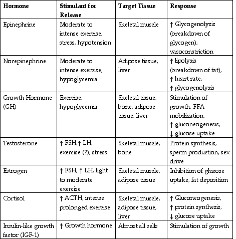 Hormone release can be stimulated by both external and internal stresses to the body. Adapting to acute exercise causes an increase in the secretion of many hormones. Several of the main hormones related to exercise and their responses are listed in Table 1.