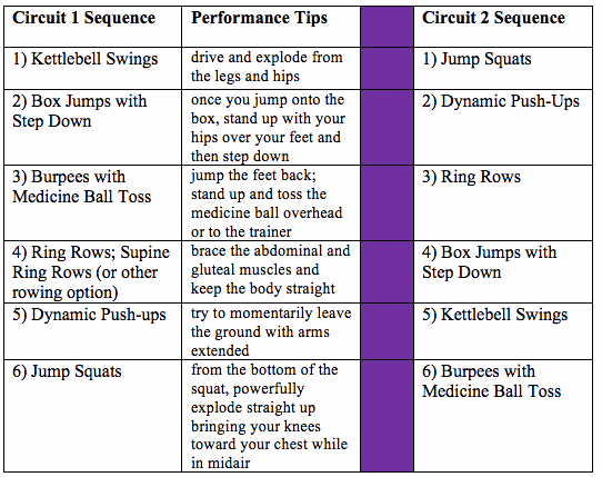 | Peak Power for Your Clients Rob Tapia and Len Kravitz, PhD Introduction The incorporation of training systems to produce maximal neuromuscular power for complex movement skills in sports has traditionally been a primary target for various athletic populations. However, many personal training clients also seek fitness programs that may successfully lead to enhanced dynamic sports movements for sports activities including tennis swings and serves, volleyball spikes, running speed, soccer performance, golf swings and vertical jumps in basketball. This article will discuss the fundamentals of neuromuscular power development and present practical ideas for fitness pros to incorporate power training with clients. What is Maximal Neuromuscular Power? Cormie and colleagues (2011a) explain that maximal power is the highest level of work attained for muscular contractions during a given amount of time. Broadly thinking, with maximal power a person is attempting to produce instantaneous speed for jumping, running, throwing, striking, swinging, or kicking, all of which are associated to one or more sports. Cormie et al. further explain that power is often called neuromuscular power due to the fact that several neural factors contribute to it, including motor unit recruitment, muscle fiber firing frequency, and synchronization of a muscle's contractile forces. Neuromuscular power is further influenced by muscle fatigue, stretch reflexes, elastic components in muscle, muscle temperature, joint configuration, muscle fiber type, muscle pennation (i.e., the way the muscle fibers align to the movement) and the type of muscle contraction (e.g., concentric, eccentric and isometric) (Cormie et al.). For term consistency throughout the rest of this column, we will use the term power, acknowledging that the neuromuscular component is intricately part of this type of training. What is the Strength and Power Relationship? Cormie and others (2011b) highlight that a person cannot produce a lot of power unless they are relatively strong. The researchers, in their review article on neuromuscular power, reference several studies that indicate individuals with greater strength have superior power production capabilities. Decisively, the development of strength will directly favor an increase in muscle fiber cross section (i.e., diameter of muscle fibers) and a host of physiological factors within muscle that contribute to improved intramuscular coordination for power production. Thus, a major take-home to fitness pros is that prior to designing power producing exercises or programs for clients, it is imperative to develop that client's foundational strength first. What is Movement Pattern Specificity? The ability to produce maximal power in multi-joint, dynamic movements is dependent on the nature of the movement pattern involved (Cormie et al., 2011b). Exercises selected for a power training program will influence the degree of improved adaptations observed if the muscles being strengthened are trained in a similar movement pattern and range of motion as used in the competitive sport. Exercise training programs that are designed for improving maximal power include traditional resistance training, ballistic exercises, plyometrics and weightlifting exercises (Cormie et al., 2011b). Each of these programs is discussed in the following sections. Traditional Resistance Training for Power Traditional resistance training for power includes exercises such as a squat and bench press. These exercises provide a beneficial effect in developing a solid foundational strength for the enthusiast. In addition, Cormie et al (2011b) explain that heavy load (&Mac179;80% of the1RM) training is a viable approach to developing power with traditional resistance training exercises, largely because it is a good stimulus to recruit the larger type 2 (i.e., fast twitch) muscle fibers in the body. The type 2 muscle fibers are considered predominately responsible for powerful athletic performance (Cormie et al). Interestingly, inherit in the traditional resistance training exercises is a slowing or deceleration phase of speed in the latter part of the movement, regardless of the load lifted. Thus, further improvements in maximal power require the involvement of other, more mechanically specific training concepts such as ballistic exercises, plyometrics and weightlifting exercise. Ballistic Exercises for Power Development Ballistic exercises include movements like a jump squat and bench press throw (of an object such as a medicine ball). Ballistic movements encourage the enthusiast to accelerate the movement pattern throughout the entire range of motion to the point of takeoff or release of the object being thrown. Unlike traditional resistance training exercises, there is no deceleration period in the movement. Ballistic exercises may be progressed by increasing the load, such as a heavier medicine ball for the bench press throw or wearing a weighted vest on the jump squat. Cormie and colleagues (2011b) note that a variety of loading conditions from 0-80% of lRM of a similar traditional resistance training exercise have been used in the research. Cormie and colleagues continue that force, power and muscle activation are higher during a ballistic movement, due to the continued acceleration of movement through the full range of motion, as compared to a similar traditional resistance training exercise. Many researchers and coaches praise the use of ballistic exercises for power development, based on the fact that ballistic exercises are generally more sport specific and therefore may provide adaptations that allow for greater transfer to sports performance (Cormie et al., 2011b). Cormie and colleagues summarize that the use of ballistic exercises in power training programs is quite effective at increasing maximal power output in sports-specific movements, and for improving power production capabilities using a variety of loading conditions. Plyome