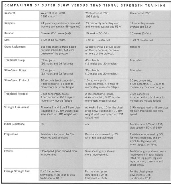 Although superslow resistance training has been around for a while, only two peer-reviewed manuscripts have been written. The first manuscript describes two studies by Westcott et al. (2001). The first Wescott et al. study was conducted in 1993 and consisted of 74 previously sedentary men and women with an average age of 56 years. The subjects were placed in groups of six and closely supervised for eight weeks. All of the subjects performed one set of 13 exercises (Nautilus equipment) three days per week. These exercises consisted of the leg extension, leg curl, leg press, neck flexion, neck extension, pullover, chest press, chest cross, lateral raise, bicep curl, triceps extension, abdominal crunch, and low back. Of the 74 subjects, 39 (10 males and 29 females) trained at a regular speed and 35 (13 males and 22 females) trained at the slow speed. Although both groups differed in the time spent in concentric phase, both groups had a 4-second eccentric phase. Each of the subjects was tested using either a 10-RM weight load (regular speed group) or a 5-RM weight load (slow speed group) at weeks 2 and 8 in the study for the determination of pre- and post-test strength assessments. The results indicated that the slow speed group attained superior strength gains, gaining an average of 26 lbs in strength for the 13 exercises combined, compared to an average of 18 lbs for the regular speed group.