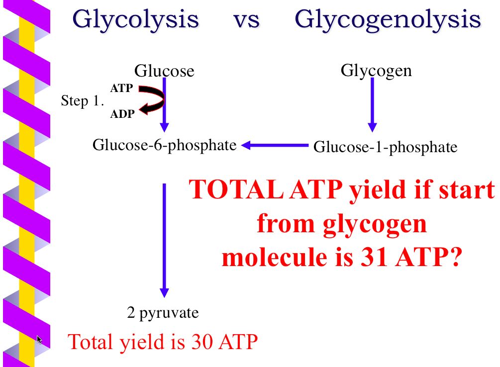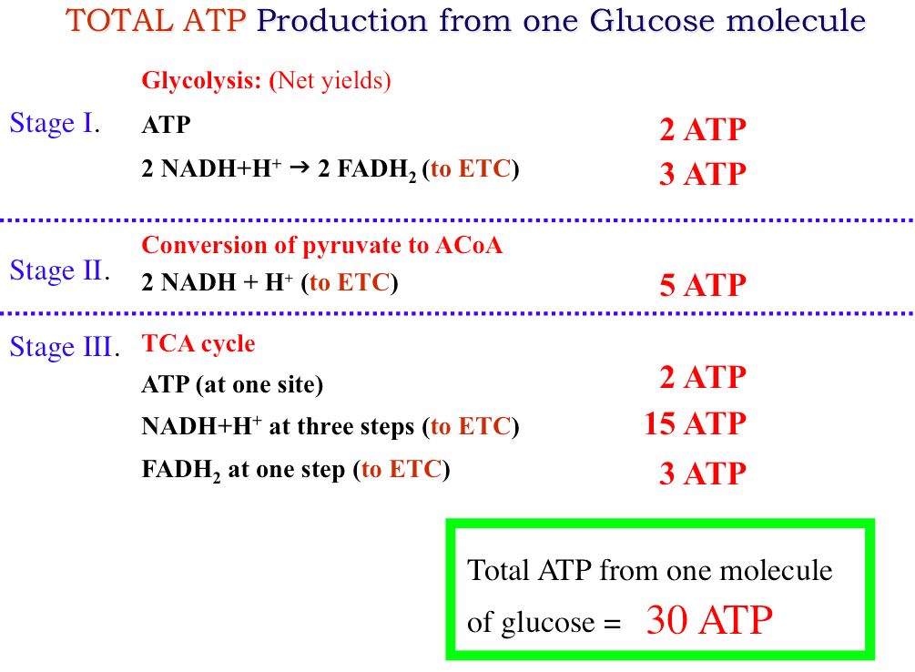 IMPORTANT THOUGHTS: EACH NADH+H YIELDS 2.5ATP AND EACH FADH2 YIELDS 1.5ATP Glycolysis: The net ATP yield is 2 ATP. And, since NADH+H shuttles its electrons and protons to FAD, reducing FAD to FADH2, the net yield is 3 ATP in the ETC. Conversion of pyruvate to ACOA: We do not produce any ATP in this stage. However, the 2 molecules of NADH+H+ will yied 5 ATP in the ETC. TCA cycle: When calculating the total ATP in the TCA cycle, remember that there are TWO ACoA molecules. So, ATP is made one place in the TCA and with 2 turns of the cycle the ATP yield is 2. NAHD+H+ is produced 6 times (from the TWO ACOA) yielding 15 ATP in the ETC. A total of 2 FADH2 are yielded from the TWO ACOA, thus yielding 3 ATP. |