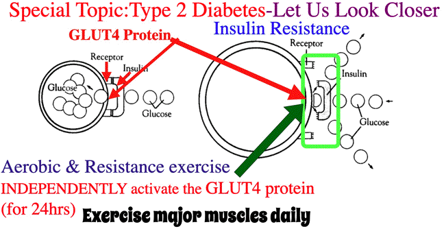 | Closer Discussion on Type 2 Diabetes: From the Youtube video and slide below, be able to describe how insulin binds with its insulin protein receptor which signals the GLUT4 Protein. |