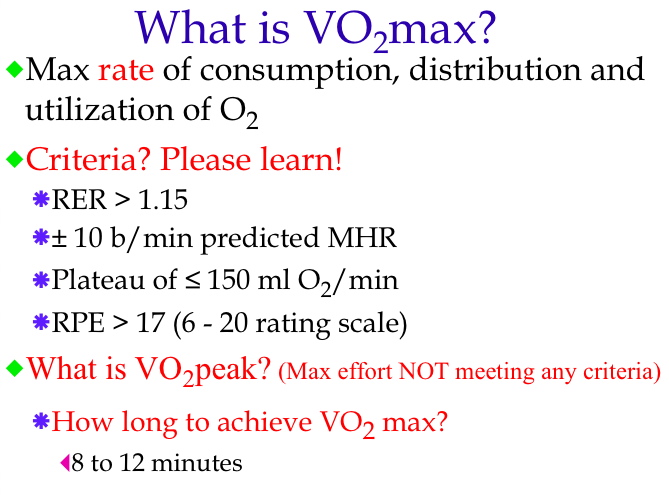 RER represents respiratory exchange ratio. This is the ratio of CO2 expired to O2 consumed Predicted (or estimated) maximum heart rate is 220-Age. So, a predicted maximum heart rate for a 20-year-old student is 220-20=200 beats per min. Remeber, we look at heart rate in beats per min. Plateau of VO2 means the following: A maximal aerobic test progressively gets harder for the sujbect. When the oxygen consumption (VO2) plateaus < 150 ml/min VO2 as the test continues to get harder it is a very good indicator that the subject is at or near their actual VO2max capacity. Note the Rating of Perceived Exertion chart below. It shows an example of the %intensity with each number. The two anchors are 6 (which is very quiet seated rest) versus 20 (which is the point of exhaustion from working as hard as you can). Although VO2peak varies from textbook to textbook, for PEP326L a VO2 peak test is when a subject gives a maximal effort in an aerobic capacity test but does NOT attain any of the criteria. It means the subject worked as hard as she/he could, but did not attain the VO2max criteria. |