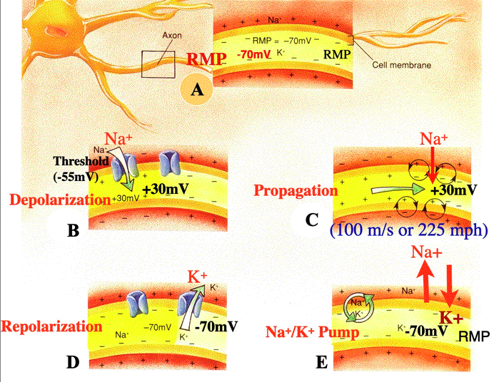 Action Potential: a) RESTING MEMBRANE POTENTIAL (RMP): RMP at -70mV. Na+ on outside and K+ on inside of cell b) DEPOLARIZATION: As depolarization reaches THRESHOLD of -55mV, the action potential is triggered (opening the voltage regulate Na+ gates) and Na+ rushes into cell. Membrane potential reaches +30mV on action potential c) PROPAGATION: Propagation (which means spreading or moving) of the action potential at 100 m/sec (which is 225 mph). Membrane potential at +30mV d) REPOLARIZATION: Repolarization occurs with K+ exiting the cell to return to -70mV (i.e., the cell restores itself to RMP) e) NA+/K+ PUMP: Return of ions (Na+ and K+) to their extracellular (Na+) and intracellular (K+) sites by the sodium potassium (Na+/K+) pump NOTE: An Action Potential is a substantial depolarization. At homeostasis, the cell is continuosly alternating from positive (depoloarization) and negative (hyperpolarization) charges. When the cell attains threshold (-55mV), the action potential occurs. CLASS: BE ABLE TO DRAW/LABEL AND EXPLAIN (WITH BULLETS) AS ABOVE |