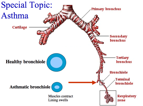 What is asthma? Asthma is a respiratory problem where air flow becomes inhibited (or restricted) at the level of the bronchioles in the bronchiole tree. Certain triggers (see below) cause the bronchiole muscles to contract and the lining to swell (inflammation), resulting in a restricted air passageway. Triggers of asthma include house dust, animal allergens (fur), tobacco, pollen, smoke, furnace air, colds and viral infections. Exercise-Induced Asthma or EIA With exercise-induced asthma (EIA) there is NO inflammation (with this respiratory problem). With EIA there is just muscle contraction that restricts the air passageway in the bronchioles. When does exercise-induced asthma usually PEAK? In most people, EIA usually peaks about 5 to 10 minutes into recovery. What is the theory explaining EIA? The current theory explaining EIA is after execise a HIGH volume of dry (cold) air dehydrates the mucosa membrane of the bronchous tubes. As this dry/cool air travels past the warming tissues it causes the bronchous to constrictrestricting air passagethis is EIA.We see EIA often in people who participate in winter sports (such as skiing or hockey). End |