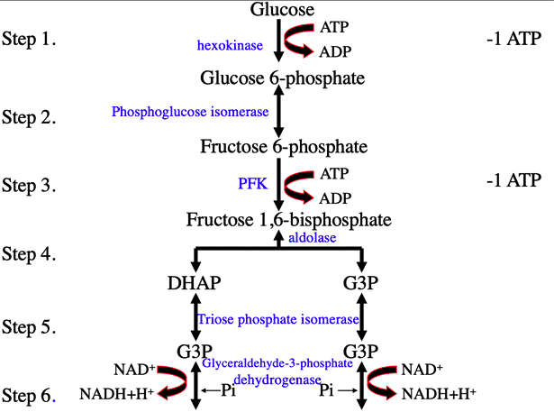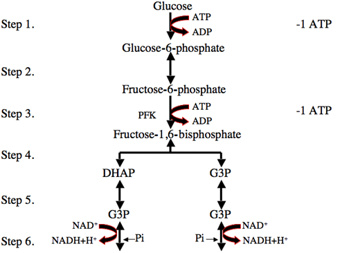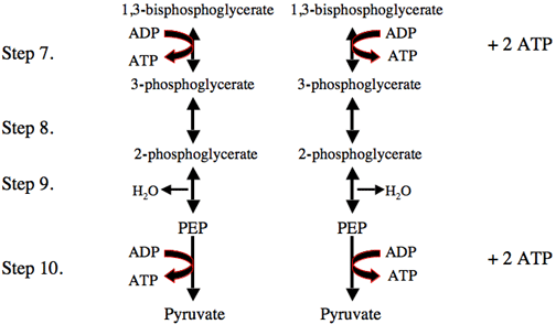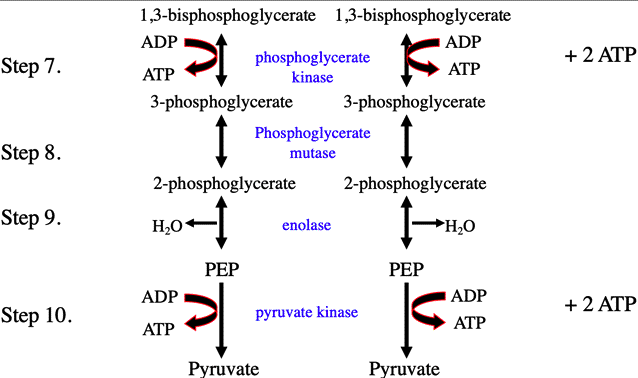 | NOTE TO STUDENTS: PLEASE LEARN GLYCOLYSIS IN THIS LINEAR DRAWING METHOD. LABEL YOUR STEPS AND SHOW YOUR ATP YIELD AS DEPICTED ABOVE. THIS WILL HELP AS WE REVISIT TO DISCUSS OTHER REACTIONS. |