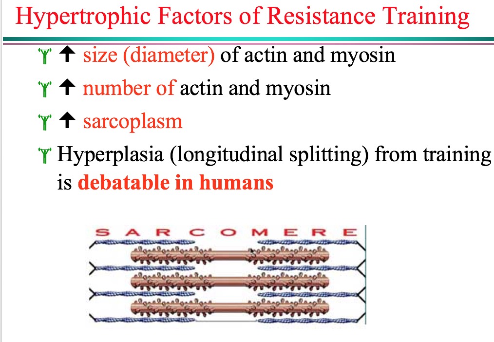 |  | Hypertrophy is an increase in DIAMETER size of skeletal muscle. With the muscle fiber this size is an increase in diameter of the muscle fiber referred to as the cross-sectional area of the muscle fiber. The changes causing this diamter size incrase are as follows; In addressing this question, always refer to what increases and what is debateable. 1) actin and myosin increase in diamter size 2) actin and myosin also increase in number 3) there is also an increase in the sarcoplasm in the muscle cell 4) Hyperplasia (the longitudinal splitting of one muscle fiber into two fibers) from training is a debatable issue in humans |  | In the first ~8-10 weeks of resistance training there are mimimal hypertrophy changes. However, a person is getting stronger. This is reflective of neural drive.With neural drive, 1) more motor units are firing, 2) synergistic (other helper muscles) are helping with the force production, and 3) the motor units are firing with greater synchronicity (i.e., simultaneousness firing). |  | | | |