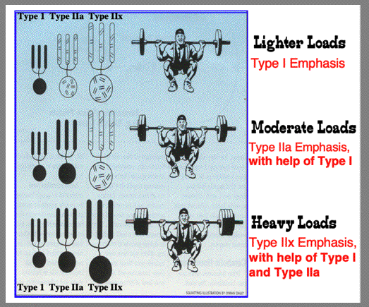 Learning Tip: Notice in the above graphic how the author is depicting the motor unit with ONE nerve innervating multiple muscle fibers on the left side of the graphic. With the top picture, the load is light for the exerciser and the Type I motor units have been innervated. In the middle picture there are more plates on the bar and thus more force to overcome. The Type IIa is doing most of the work with the help of the Type I. In the bottom picture, there are many plates on the bar requiring near maximal exertion of the exercise. This recruits the most powerful motor units in the body, the Type IIx and you see the Type IIa and Type I are helping. Thus with any load of work you notice how the Type I fibers are always firing. |