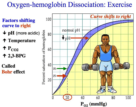 What is the Bohr effect in exercise physiology? Class, notice how with EXERCISE the oxygen-hemoglobin curve shifts to the RIGHT. This is because of four factors: 1) The decrease in pH (from the muscle cells getting more acidic) 2) An increase in muscle temperature (from muscle contraction) 3) An increase in the partial pressure of carbon dioxide (from the working muscles) 4) An increase of a byproduct molecule from glycolysis known as 2,3-BPG. This shifting of the curve to the RIGHT (from these 4 factors) is referred to as the Bohr effect. Christian Bohr is the scientist who first explained this occurence from aerobic exercise. WHY IS THE BOHR EFFECT HELPFUL FOR AEROBIC EXERCISE? When the curve shifts to the RIGHT in the Bohr effect, the blood is RELEASING MORE OXYGEN to tissues (i.e. muscles) for Aerobic Exercise! END |